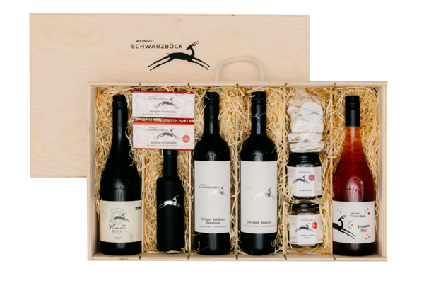 Diese große Geschenksbox umfasst ausgewählte Lagenweine, Frizzante mit & ohne Alkohol sowie verschiedene Delikatessen.